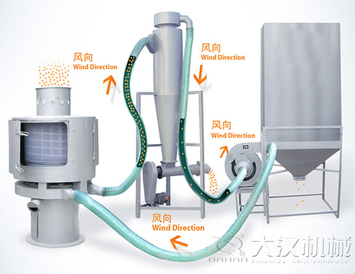 立式氣流篩由進料口、螺旋輸送系統、驅動電機、細料出料口、除塵口、網籠、風輪葉片、風輪、主軸、出料出料口、底座等組成。